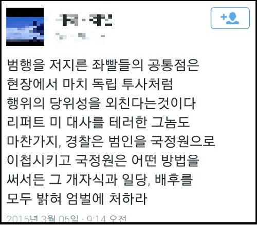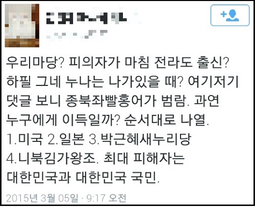실제로 일부 네티즌들은 “빨갱이들 반드시 잡아 족 쳐야한다”, “이 나라에 진보는 없다. 국가 전복만 모의하는 종북좌빨 빨갱이들만 있을 뿐”, “민주화를 외치면서 뒤에서는 나라를 뒤집으려는 종북당과 빨치산 빨갱이들을 다 잡아들여라”, “역시 전라도 놈이였어~” 등의 반응들을 내놓고 있다.