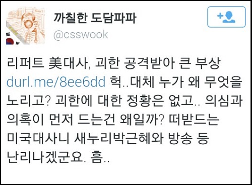 이밖에도 “폭력은 어떠한 방법으로도 정당화가 될 수는 없다”, “이유불문. 한심하다. 상황이 그럴 상황이냐?”, “종북 빨갱이하고 아무런 관련이 없는 사람이다. 순전히 개인적인 일이다”, “빨리 쾌유하기를 빕니다. 대한민국인으로서 미안하네요”, “지금 미국방송사들 정규방송 안하고 습격당한 것만 계속 생중계로 보도하고 있음”이라는 등 우려의 목소리도 이어지고 있다.