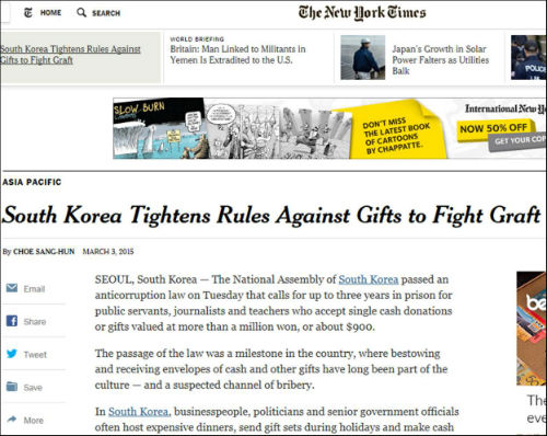 <NYT>는 “한국 국회는 언론인, 교사 그리고 공직자가 백만 원 혹은 910달러 이상의 현금 혹은 이에 해당하는 선물을 받을 경우 최고 3년형을 선고받게 하는 반부패법을 통과시켰다”며 “이 법의 통과는 현금봉투와 기타 선물 등을 주고받는 것이 오랫동안 문화의 일부가 되어왔고 뇌물의 통로로 의심받아온 한국에서 획기적인 사건”이라고 전했다.