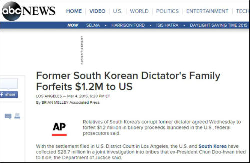 4일(현지시간) <ABC>는 <AP통신>의 보도를 받아 “한국의 부패한 전 독재자 일가가 미국에서 돈세탁한 120만 달러의 부정축재 재산 몰수에 동의했다고 연방 검찰이 말했다”고 보도했다.