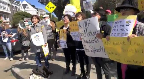 한편, 이날 시위대 맞은편에는 재향군인회 미 북서부지회 등이 ‘We love 박근혜’, ‘북한 지지자는 북으로 가라(N.Korean supporters go to N.K)’ 등의 피켓을 들고 맞불시위를 벌였다.
