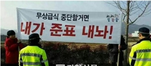 18일 일부 시민들은 ‘무상급식 중단할거면 내가 준표 내놔!’란 글귀가 적힌 플래카드를 들고 홍준표 지사의 무상급식 중단에 항의하기도 했다.