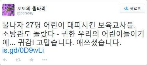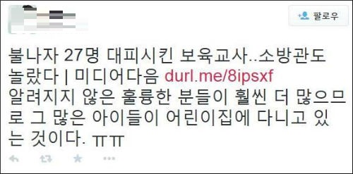 보육교사들의 침착한 대처에 네티즌들은 칭찬과 응원 글들을 잇따라 게시했다.