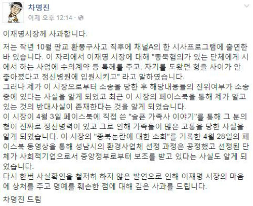 6일 차명진 전 의원은 자신의 페이스북을 통해 “이재명 시장께 사과합니다”라며 “이 시장으로부터 소송을 당한 후 해당 내용들의 진위여부가 소송 중에 있다는 사실을 알게 되었고 최근 이 시장의 페이스북을 통해 제가 알고 있는 것의 반대사실이 존재한다는 것을 알게 되었다”고 밝혔다.