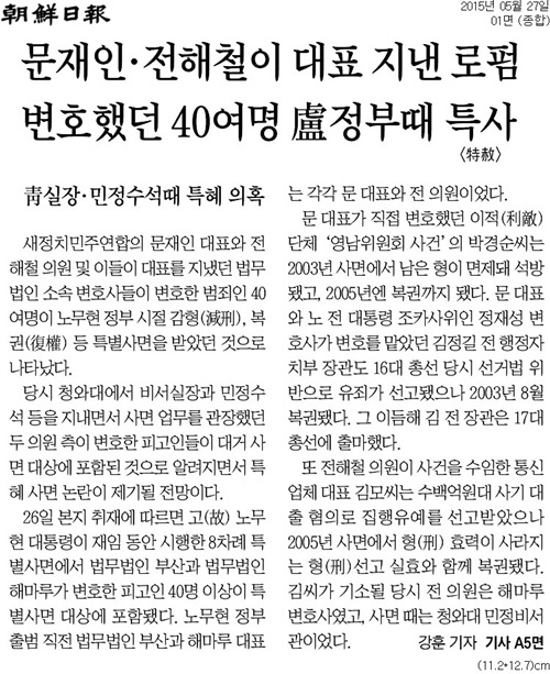 <조선일보>는 27일 1면 기사로 “문 대표와 전 의원 및 이들이 대표를 지냈던 법무법인 소속 변호사들이 변호한 범죄인 40여명이 노무현 정부 시절 감형, 복권 등 특별사면을 받았던 것으로 나타났다”며 “당시 청와대에서 비서실장과 민정수석 등을 지내면서 사면 업무를 관장했던 두 의원 측이 변호한 피고인들이 대거 사면 대상에 포함된 것으로 알려지면서 특혜사면 논란이 제기될 전망”이라고 보도했다.