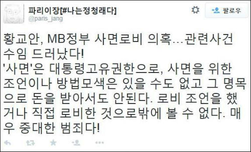 황교안 국무총리 후보자의 이른바 ‘19금 사건’에서 MB정권 말기에 사면과 관련한 자문이 있었던 것을 두고 ‘사면 로비’ 의혹이 제기됐다.