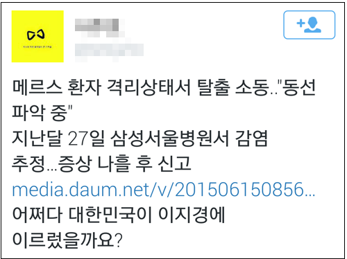 한편, 해당 소식을 접한 네티즌들은 일제히 분노했다. 네티즌들은 “이와 중에 정말 민폐네요”(@buss***), “어쩌다가 대한민국이 이지경에 이르렀을까요?”(@seoj***), “메르스가 확산 될수록 이런 환자들이 늘어날 것 같다”(@dal***), “초기 대응에 실패한 정부에 이어 이젠 제멋대로 하는 사람들 때문에 난리다”(@lijoe***) 등의 반응을 보이며 혀를 찼다.