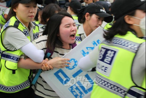 조합원들은 경찰에 연행되면서도 “최저임금 1만원으로”, “사람답게 살고 싶다” 등을 외치기도 했다.