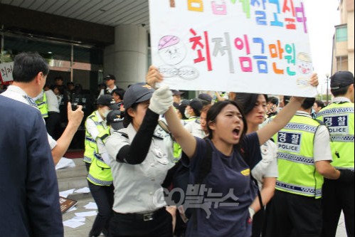 경찰은 오전 10시 42분 미신고 불법 집회라며 5차 해산 명령을 내린 바 있다. 2015년 현재 최저임금은 시급 5,580원으로 주 40시간을 기준으로 월 1,166,220원이다.