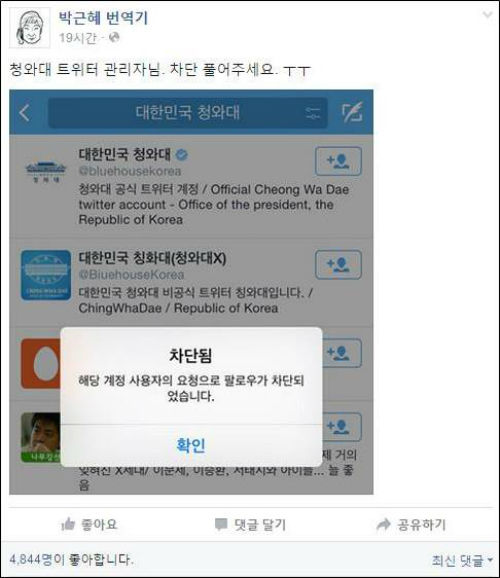 25일 ‘박근혜 번역기’ 운영자는 자신의 SNS에 “청와대 트위터 관리자님, 차단 풀어주세요”라는 글을 게시했다.