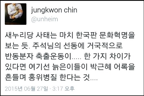 그는 트위터를 통해 이같이 적고는 “주석님의 선동에 거국적으로 반동분자 축출운동이.....”라면서 “한 가지 차이가 있다면 여기선 늙은이들이 박근혜 어록을 흔들며 홍위병질 한다는 것....”이라고 덧붙였다.