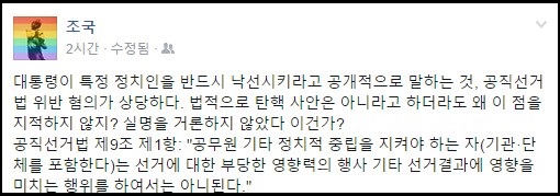 이와 관련 조 교수는 28일 자신의 페이스북에 “공직선거법 위반 혐의가 상당하다”고 지적하면서 “법적으로 탄핵 사안은 아니라고 하더라도 왜 이점을 지적하지 않는지”에 대한 의문을 제기하기도 했다.