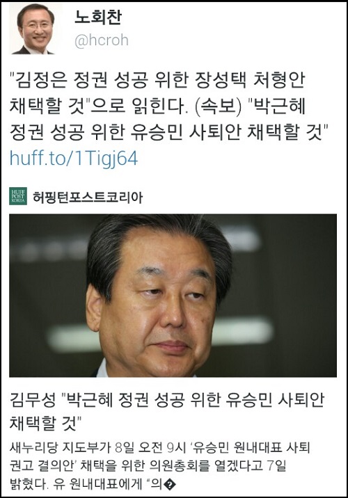 노회찬 전 정의당 의원은 김무성 대표의 “박근혜 정권의 성공을 위한 ‘원내대표 사퇴 권고 결의안 채택’” 발언이 “‘김정은 정권 성공 위한 장성택 처형안 채택할 것’으로 읽힌다”고 비꼬았다.