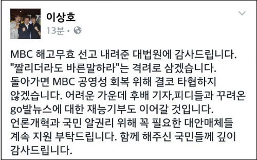 판결 직후 이상호 기자는 페이스북을 통해 이 같은 소식을 전하면서 “MBC 해고무효 선고 내려준 대법원에 감사드린다”면서 “‘짤리더라도 바른말하라’는 격려로 삼겠다”는 소회를 밝혔다.