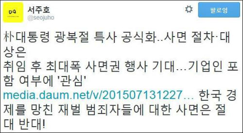 한 네티즌(솔*)은 “국면 전환용 사면인가?”라고 지적했고, 또 다른 네티즌(너구*)은 “부패한 정치인과 기업인들 사면은 절대 반대”라고 주장했다.