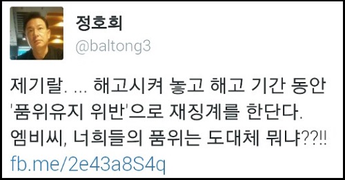 그런가하면 ‘웹툰 해고’ 권성민 예능PD는 사측이 해고기간 중 이상호 기자의 트위터 내용을 전부 모니터한 것을 두고 “대학 때 MT 가서 진상 부린 것까지 다 찾아내서 징계하지 왜, 싸이 가면 많을거야”라면서 “품위 되게 좋아한다. 속옷까지 다려 입고 백마 타고 다녀야할 듯”이라고 비꼬았다.