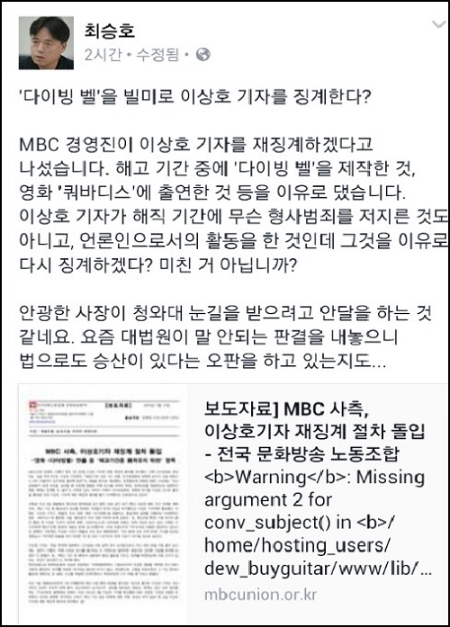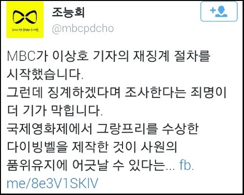 최 PD는 또 페이스북에 “안광한 사장이 청와대 눈길을 받으려고 안달을 하는 것 같다”고 꼬집으면서 “요즘 대법원이 말 안 되는 판결을 내놓으니 법으로도 승산이 있다는 오판을 하고 있는지도...”라며 사측의 행태를 비난했다.