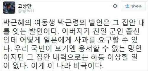 고상만 인권운동가도 SNS에 “박근령의 발언은 그 집안 대를 잇는 발언”이라며 “아버지가 친일 군인 출신인데 어떻게 일본에게 사과를 요구할 수 있나. 우리 국민이 보기엔 용서할 수 없는 망언이지만 그 집안 내력으로는 하등 이상할 일이 없다. 이게 이 나라 비극”이라고 밝혔다.