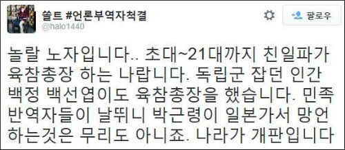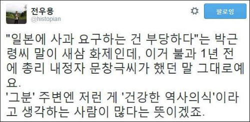 전우용 역사학자도 “1년 전에 총리 내정자 문창극씨가 했던 말 그대로다”며 “‘그 분’ 주변엔 저런게 ‘건강한 역사의식’이라고 생각하는 사람이 많다는 뜻이겠죠”라고 일침을 놓았다.