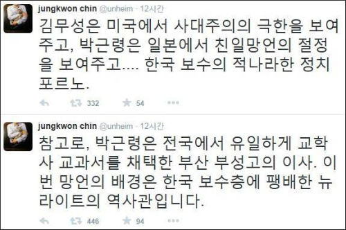 진 교수는 “참고로 박근령은 전국에서 유일하게 교학사 교과서를 채택한 부산 부성고의 이사”라며 “이번 망언의 배경은 한국 보수층에 팽배한 뉴라이트의 역사관”이라고 꼬집었다.