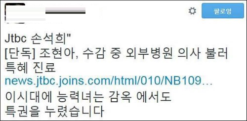하지만 법무부의 설명에도 불구하고, 조 전 부사장의 의료 특혜 대한 비난여론은 들끓고 있다. 해당 소식을 접한 네티즌들은 “대한민국 법치가 얼마나 유명무실한지 보여 주는 사례다”(@id0***), “법무부는 하반기 정기 인사라는 입장인가?”(@soi***), “이 시대의 능력녀는 감옥에서도 특권을 누리는구나”(@diva***) 등의 반응을 보였다.
