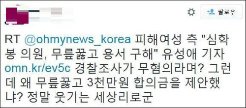 특히 심 의원이 피해 여성에게 무릎을 꿇고 사과하며 3천만원의 합의금을 주겠다는 제안을 했다는 보도가 나오면서 비난 반응이 잇따르고 있다.