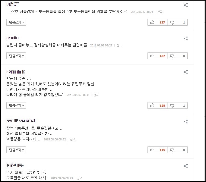 이 같은 소식에 온라인상에서는 ‘대통령의 사면권은 극히 제한적으로 행사되어야 한다’는 지적과 함께 ‘광복절의 의미가 땅에 떨어졌다’는 비판이 나오고 있다.