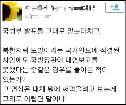 트위터 등 SNS상에서도 비판이 잇따르고 있다. 네티즌들은 “북한이 쳐들어와도 서면보고 할건가”, “보고만 받고 조치는 없고.. 맨날 늑장대응”, “무능의 극치”, “대체 누구랑 일을 하는 거냐”라며 비난을 쏟아냈다.