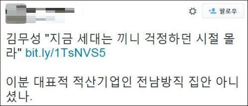 이 밖에도 “빈부격차가 이리 심해졌는데”(우너**), “지금 자식뻘 되는 젊은 층이 취업 안 되는 그런 상황은 겪어보셨나?”(메가***), “대통령되면 볼 만하겠네요”(Mi*****), “끼니 걱정을 아는 사람이 그래?”(내일**), “자학과 분노와 저주의 역사??”(뽐은***), “말이면 다인 줄 아는가”(Fron****), “그 당시 대부분 겪어봤을 끼니 걱정을 보기만 했겠지”(뿜*), “다이아몬드 수저의 헛소리”(pri**) 등의 비난 반응들이 잇따랐다.