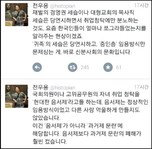 그러면서 “‘귀족’의 세습은 당연시하고, ‘중인층’ 임용방식만 문제 삼는 게, 바로 신분사회의 문화”라고 비판했다.