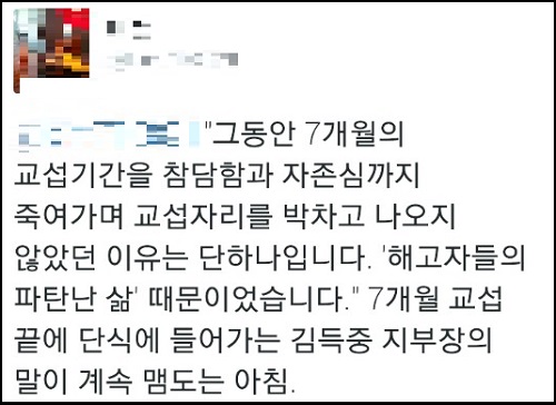 김 지부장은 “노노사교섭에서 보여준 사측의 태도는 해고자들의 절박한 마음을 악용하는 것 그 이상도 이하도 아니었다”면서 “내용적 접근과 이견을 떠나 회사측의 입맛에 맞게 이용당했다는 그 배신감에 치를 떨지 않을 수 없다”고 개탄했다.