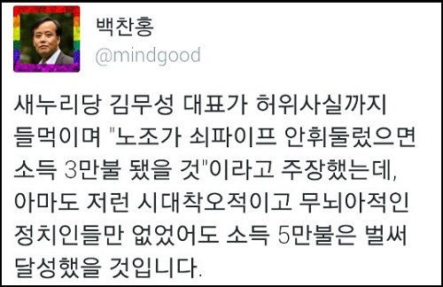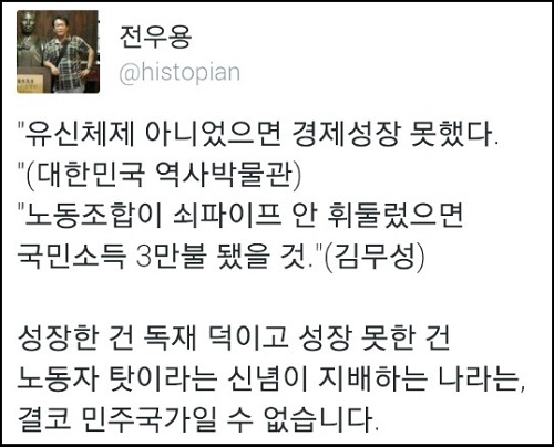 역사학자 전우용 씨는 “성장한 건 독재 덕이고 성장 못한 건 노동자 탓이라는 신념이 지배하는 나라는 결코 민주국가일 수 없다”고 꼬집었다.