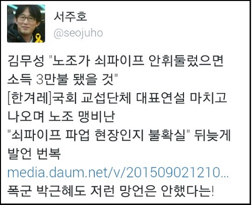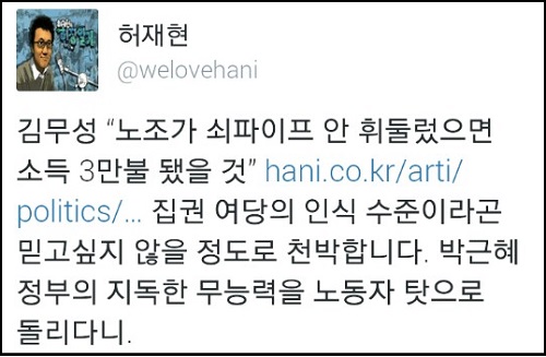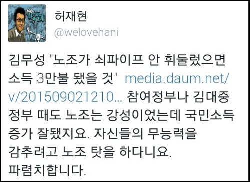 이밖에도 온라인상에서는 “깡패 시켜서 사람 두들겨 팬 재벌 회장님 집유로 풀어주는 나라에서 할 말은 아니다”, “노조 없고 파업 없으면 북한이랑 뭐가 다르냐”, “정치인들이 부패하지 않았으면 사만불 되고 복지문제 걱정 없는 나라 됐다”, “그 노동자들 덕에 우리가 지금 이만큼 사는거다”라는 등의 비판 댓글이 잇따르고 있다.