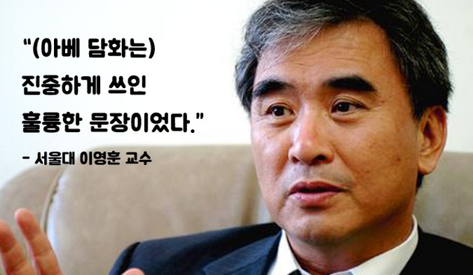 <연합뉴스>에 따르면, 이 교수는 이날 아베 담화에 대해 “진중하게 쓰인 훌륭한 문장”이라고 평가 하는가하면, 일본이 자유·민주주의·인권의 기본적 가치를 공유하는 나라와 손잡고 평화와 번영의 세계를 건설하겠다는 담화 마지막 대목을 읽으면서 머리를 둔기로 치는 것 같은 느낌을 받았다고 말했다.