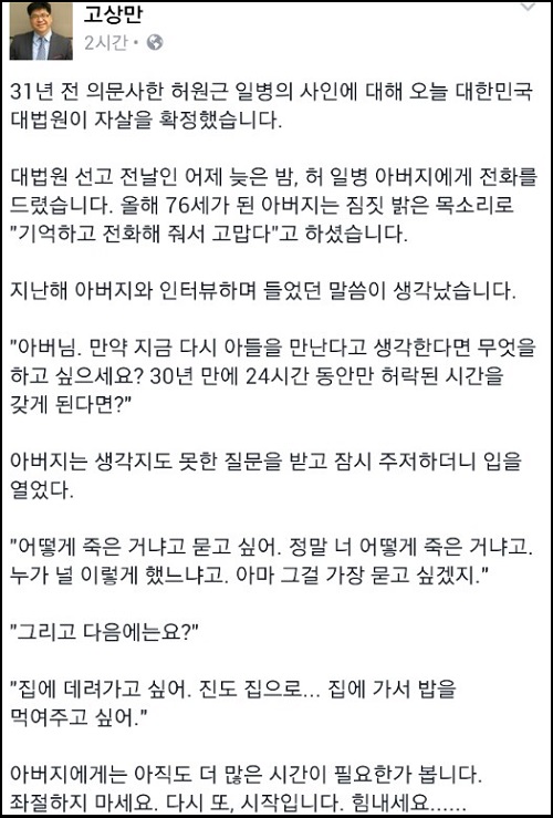 고상만 전 의문사진상규명위 조사관은 이날 자신의 페이스북을 통해 “의문사한 허원근 일병의 죽음에 대해 대법원이 자살을 확정했다”면서 “자살하기 위해 M-16으로 자기 몸에 세발을 쏘고 죽는 게 가능하다고 판단한 것”이라며 대법원의 판결을 비판했다.