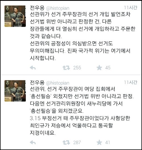 역사학자 전우용 박사 또한 자신의 트위터를 통해 “선관위가 선거 주무장관의 선거개입 발언조차 선거법 위반 아니라고 판정한 건, 다른 장관들에게 더 열심히 선거에 개입하라고 주문한 것과 같다”고 꼬집었다.