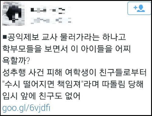 역사학자 전우용 박사는 자신의 트위터를 통해 “입시 담당 교사가 성추행으로 중징계를 받자, 피해 학생에게 ‘내가 수시 떨어지면 네가 책임져’라고 했다는 저 학생. 오늘의 대한민국이 키워낸 내일의 대한민국”이라고 개탄했다.