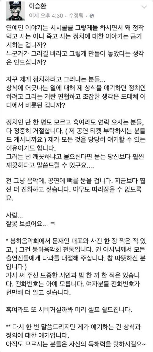 16일 이승환 씨는 자신의 페이스북에 “연예인 이야기는 시시콜콜 그렇게들 하시면서 왜 정작 먹고 사는 아니 죽고 사는 정치에 대한 이야기는 금기시하는 겁니까?”라며 “누군가가 그러길 바라고 그렇게 만들어 놓았다는 생각은 안 드십니까?”라는 글을 적었다.