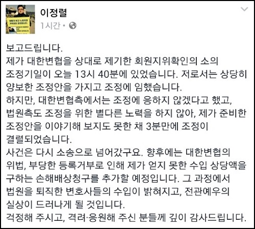 변호사 등록을 거부한 대한변호사협회를 상대로 회원지위확인 소송을 제기한 이정렬 전 창원지법 부장판사가 대한변협과의 조정이 결렬됐다고 밝혔다.