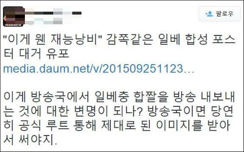 점점 교묘해지는 합성 이미지 등에 네티즌들은 비판 반응들을 쏟아냈다. 지상파 3사에서 이같은 일베 이미지가 전파를 타면서 사회적 물의를 일으키고 있기 때문. <SBS>는 최근 ‘암살’ 포스터를 포함해 7차례나 방송 사고를 냈다.
