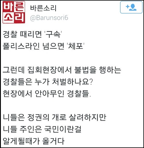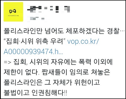 박 변호사는 “(경찰은)폴리스라인을 침범하면 체포하겠다든지, 정복을 입은 경찰을 폭행하면 무조건 구속시키겠다는 식으로 접근하고 있기 때문에 오히려 시민과 국민의 기본권을 침해하고 여러 가지 권리를 제약할 수 있는 것으로 보고 있다”며 이같이 말했다.