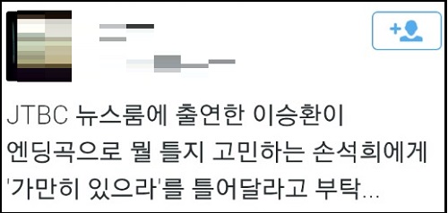 한편, 이승환 씨는 해당 방송에서 손석희 앵커가 “뉴스 끝날 때 어떤 곡을 낼지 고민 중”이라고 말하자, 자신의 새앨범에 담긴 세월호 추모곡 ‘가만히 있으라’를 추천하기도 했다.