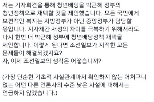 이재명 시장은 5일 자신의 페이스북 <청년배당이 돈 살포라구요? 조선일보에게 묻습니다>라는 제목의 글을 통해 <조선>의 주장은 “보편적 복지와 대의 민주주의에 대한 무지와 유권자 비하”라며 강하게 비판했다.