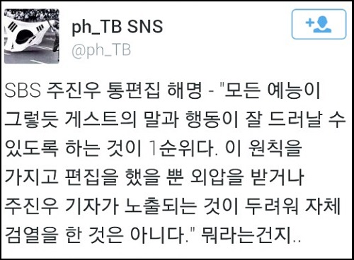 주진우 기자 통편집 논란에 SBS 관계자는 <조이뉴스 24>에 “주진우 기자의 통편집 논란은 맞지 않다”며 “촬영 당시에 주진우 기자의 발언이 생각보다 많지 않았다”고 해명했다.