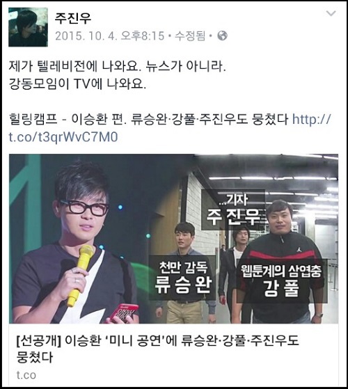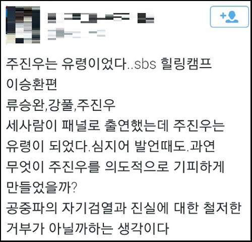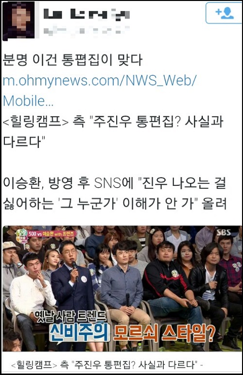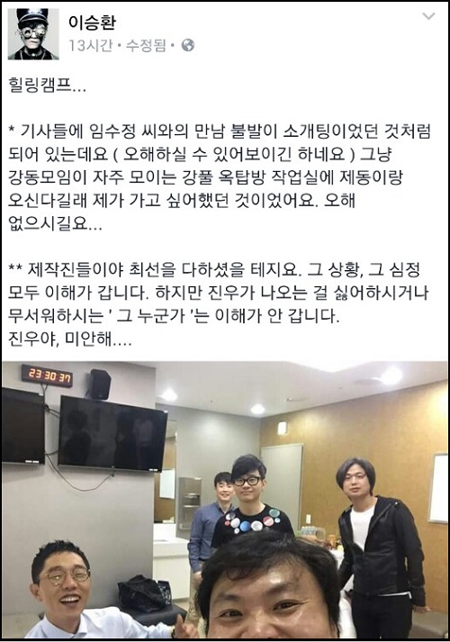 이씨는 6일 페이스북에 “제작진들이야 최선을 다하셨을 테지요. 그 상황 그 심정 모두 이해가 갑니다”라면서 “하지만 (주)진우가 나오는 걸 싫어하시거나 무서워하시는 ‘그 누군가’는 이해가 안갑니다. 진우야, 미안해....”라는 글을 남겼다.