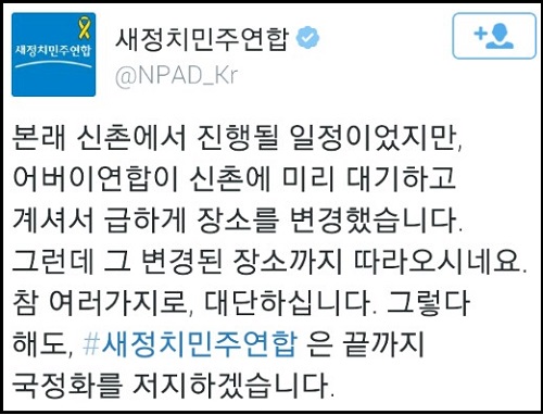 이 과정에서 대한민국어버이연합회·보수국민연합·탈북어버이연합 등에서 모인 100여명이 행사장을 찾아 욕설 등을 퍼부으며 새정치연합 의원들의 대국민 홍보전을 방해했다.