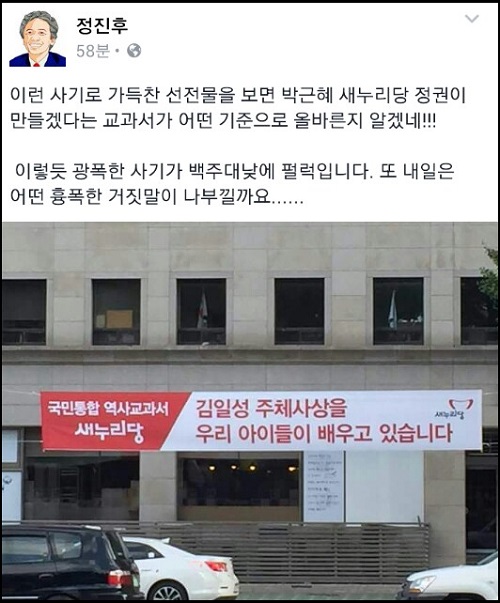 또 정의당 정진후 의원은 “이런 사기로 가득찬 선전물을 보면 박근혜 새누리당 정권이 만들겠다는 교과서가 어떤 기준으로 올바른지 알겠다”면서 “이렇듯 광폭한 사기가 백주대낮에 펄럭입니다. 또 내일은 어떤 흉폭한 거짓말이 나부낄까요”라고 개탄했다.
