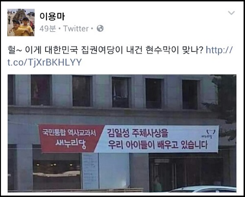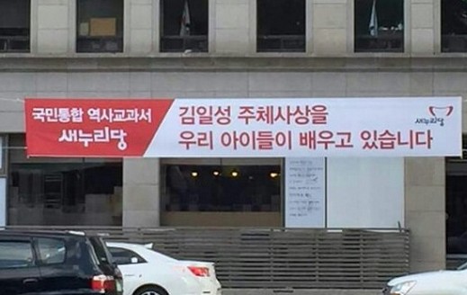 “김일성 주체사상을 우리 아이들이 배우고 있습니다”라는 문구가 적힌 새누리당 현수막이 SNS를 통해 확산되면서 논란이 일고 있다.