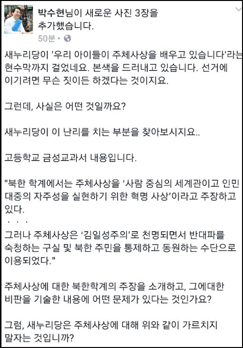 새정치민주연합 박수현 의원은 13일 자신의 페이스북을 통해 “새누리당이 ‘우리 아이들이 주체사상을 배우고 있습니다’라는 현수막까지 걸었다”면서 “(새누리당이) 본색을 드러내고 있다. 선거에 이기려면 무슨 짓이든 하겠다는 것”이라고 비판했다.