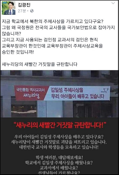 같은 당 김광진 의원도 새누리당의 이 같은 주장을 지적하고는 “그럼 왜 국정원은 전국의 교사들을 국가보안법으로 잡아가지 않습니까”라면서 “그리고 지금 사용되는 검인정 교과서의 검인은 현직 교육부장관이 한 것인데 교육부장관이 주체사상교육을 승인한 것이냐”고 질타했다.